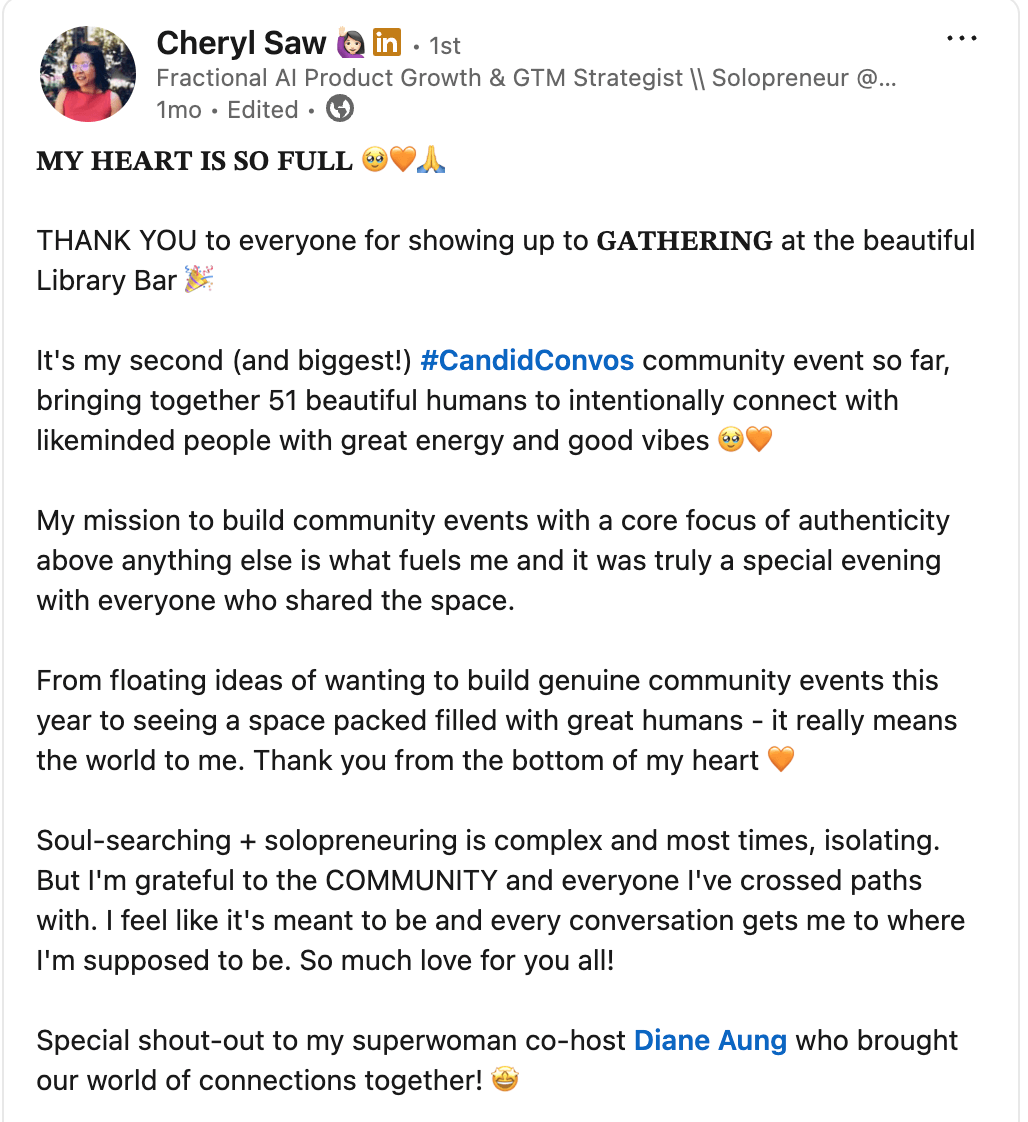 Cheryl Saw’s CandidConvos gathering does something similar - her last event brought 51 people into a room to connect around authenticity and good energy.